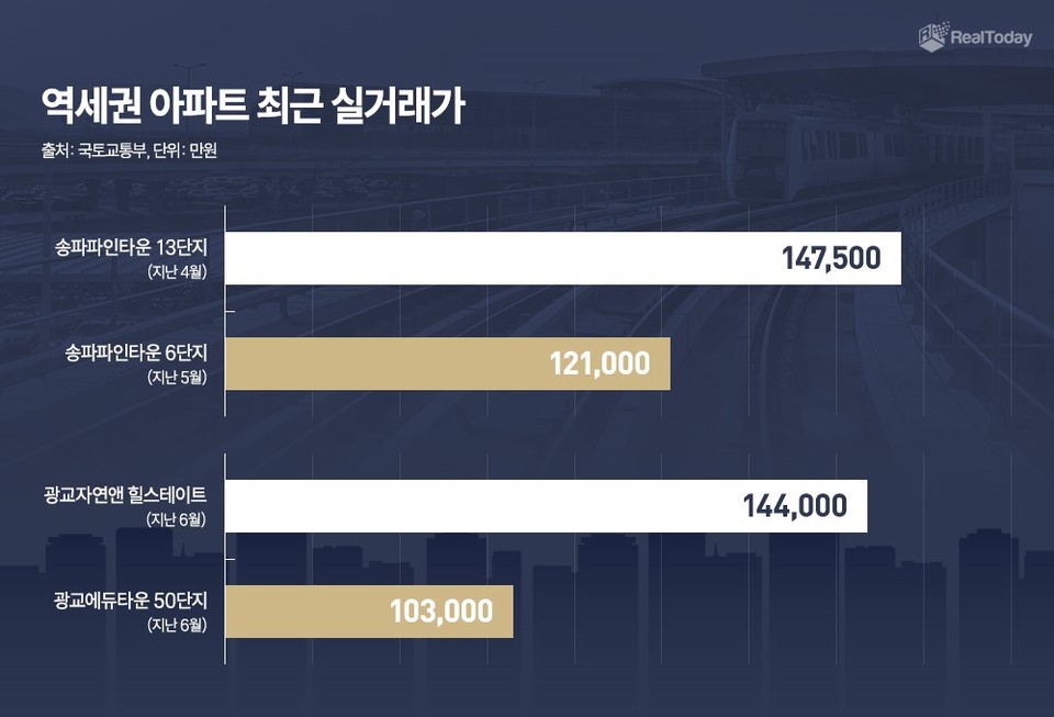경기에서도 마찬가지다. 광교중앙역 초역세권 아파트 ‘광교자연앤힐스테이트’ 전용면적 84㎡는 지난 6월 14억4,000만원에 거래됐다. 역시 비교적 거리가 있는 ‘광교에듀타운50단지’의 6월 거래가격(10억3,000만원, 전용면적 84㎡기준)대비 4억이 넘게 차이 나는 금액이다.