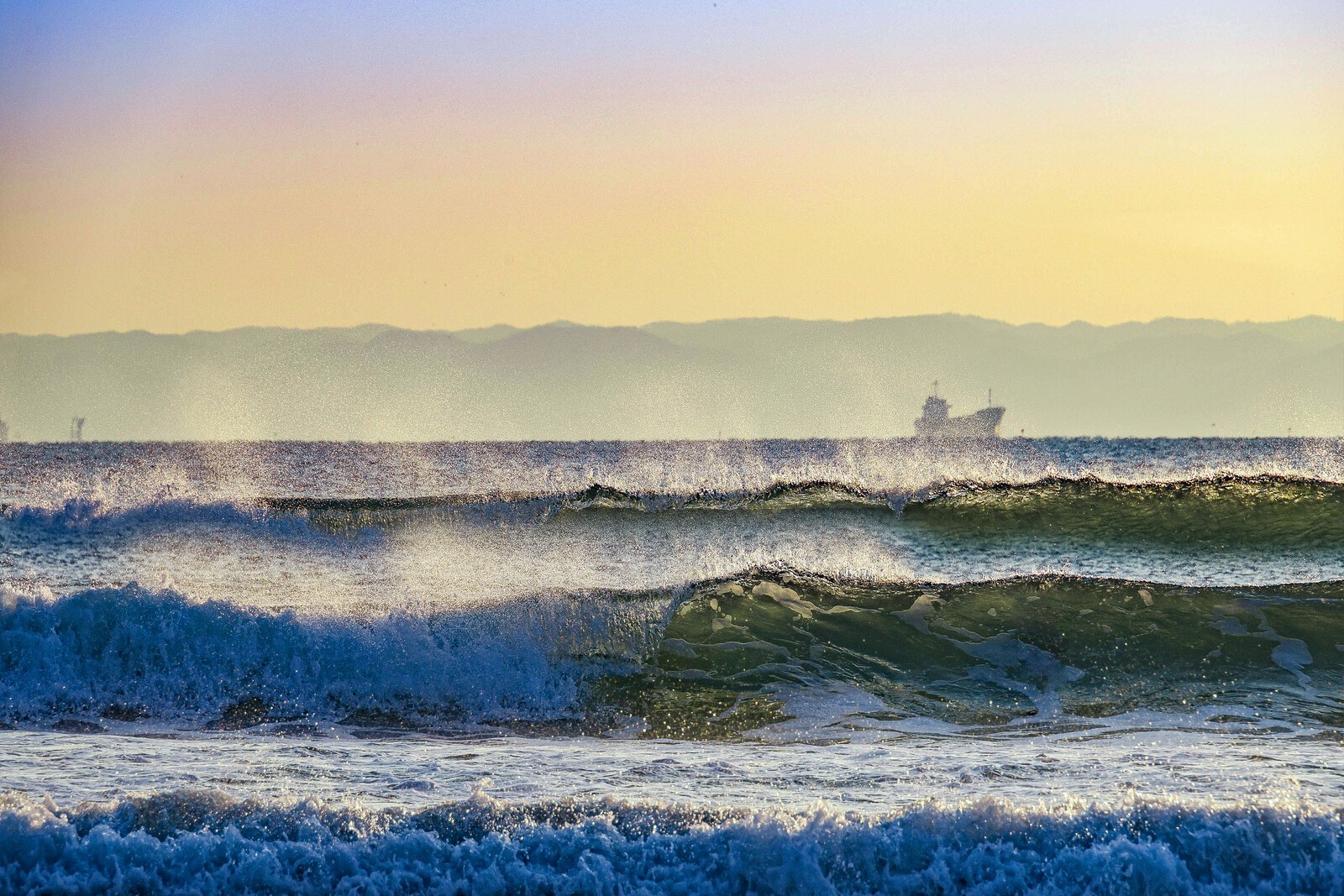 수평선 너머로 보이는 산맥과 선박은 해양의 광활함과 자연의 힘 그리고 인간 활동의 조화를 보여준다.